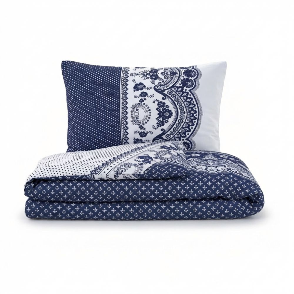 Ložní povlečení je vyrobeno z velmi jemné tkaniny s vysokou hustotou jemných přízí. Klasické bavlněné povlečení CANZONE modré zdobí jemný bílý vzor a drobné puntíky na modrém podkladu.