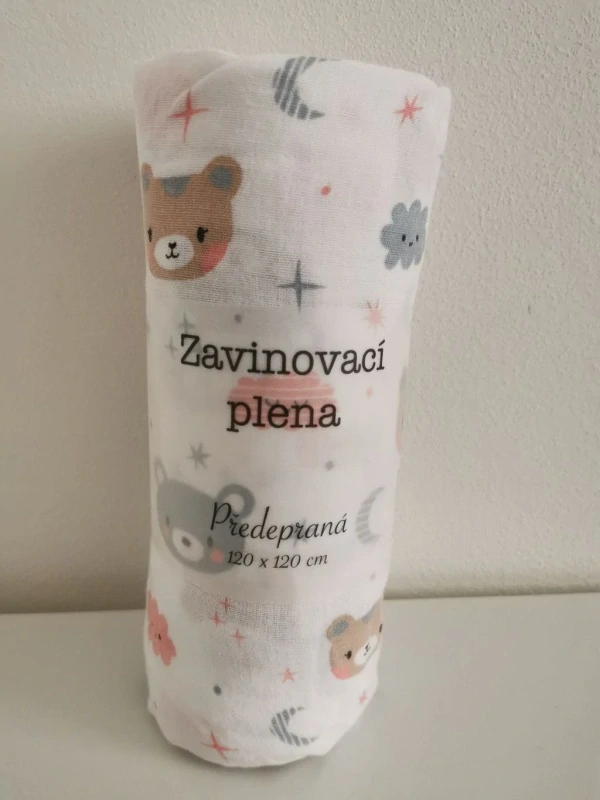 Kvalitní zavinovací předepraná bavlněná plena s potiskem 120x120cm. Zavinovací plena je vyrobena z čisté bavlněné příze, která je předepraná a je nejlepší pro styk s jemnou dětskou pokožkou. Zavinovací plena je jemná, měkká a příjemná na dotyk - je jemnější a měkčí než klasická plenka. Zavinovací plenku lze vzhledem k její velikosti 120x120 cm použít také jako osušku, plenku na kočárek, lehkou přikrývku v parných dnech, přikrývku při kojení, nebo jako podložku pod mimiko do postýlky i do kočárku. Zavinovací plenku lze vyvářet na 95°C, žehlit na vysoký stupeň. Vysoká kvalita šití minimalizuje možnost třepení. 1.jakost Gramáž: 110 gramů/m2, Certifikát Oeko-tex Standard 100