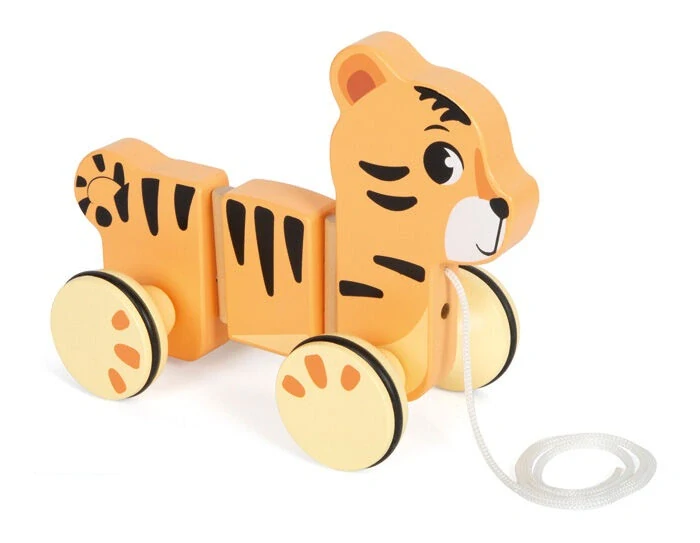 Roztomilý tahací tygřík potěší všechny malé objevitele. Vyrobený ze 100% certifikovaného dřeva FSC®, je nejen ekologický, ale i mimořádně odolný. Díky pogumovaným, tichým kolečkům se hladce pohybuje po podlaze, zatímco flexibilní třídílné tělo se při tažení krásně vlní. Součástí je i tahací provázek, který dětem usnadňuje vedení tygříka a zároveň podporuje jejich samostatnost při chůzi. Jeho přátelský design v safari stylu si děti okamžitě zamilují. Tento veselý společník podporuje rozvoj motoriky, rovnováhy i první krůčky těch nejmenších.